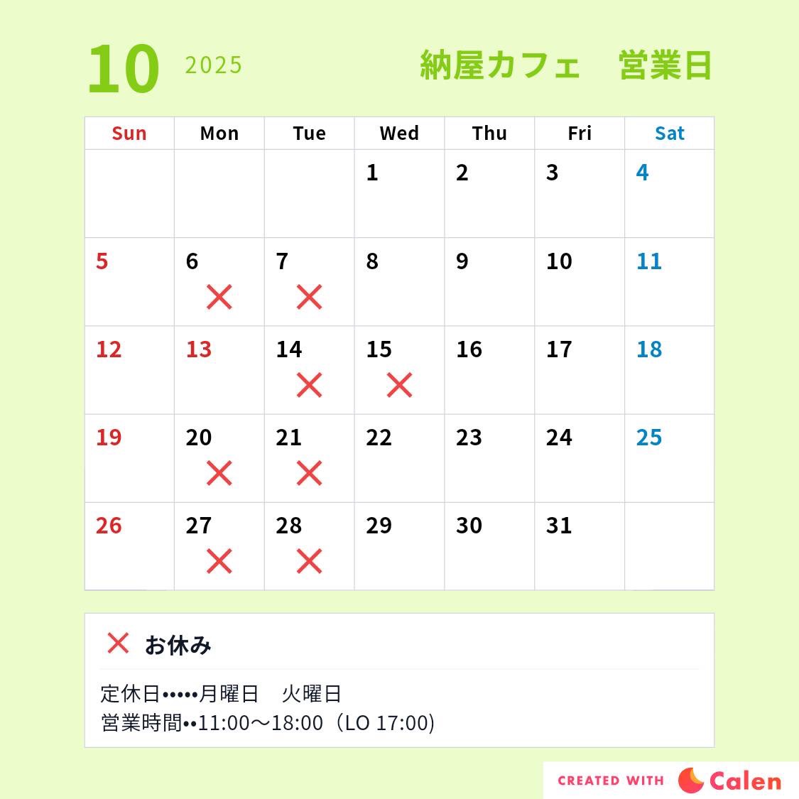 月曜日・火曜日 (祝日は営業)変則休業の場合もありますので当HP「ブログ」やInstagramをご覧ください。